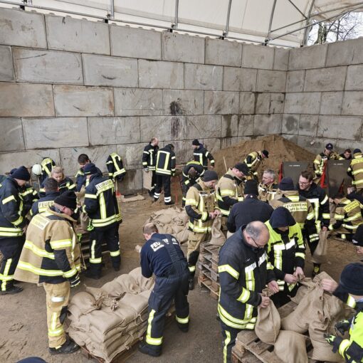 Gleichzeitig wurde ein Bauunfall in einer Sandkuhle mit einem Verschütteten gemeldet, um diese Lage abzuarbeiten wurde der Fachzug Technische Hilfeleistung von der Schule abgezogen. Bei Ankunft lief bereits ein panischer Bauarbeiter auf die anrückenden Kräfte zu, um auf seinen Kollegen aufmerksam zu machen, der bis zum Hals verschüttet worden war. Mittels Schaufeln, Spaten, Hölzern, Steckleitern und weiteren Hilfsmittel wurde die Rettung eingeleitet. Da die Sandkuhle mit den Großfahrzeugen nicht befahrbar war, musste das Material in den Arbeitsbereich getragen werden. Zum sicheren Arbeiten und um Nachrutschen des Sandes zu verhindern, wurden die Rettungsbühnen aus Schwarmstedt und Walsrode sowie Bauhölzer in Stellung gebracht. Zum Eigenschutz wurden die Helfer mit Leinen gesichert, bevor sie in den Gefahrenbereich vorgingen. Das THW wurde angefordert, um die Rettung zu unterstützen. Der geschockte Kollege wurde bis zum Eintreffen des Rettungsdienstes von der Feuerwehr betreut.