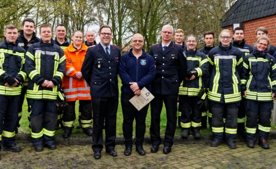 Im Rahmen des mittlerweile 148. Atemschutzgeräteträgerlehrganges wurde Ausbilder und Lehrgangsleiter Hans-Dieter Müller für 15-jährigen Ausbildertätigkeit geehrt. Kreisausbildungsleiter Sebastian Stelter und Thorsten Zölle überbrachten den Dank des Landkreises Verden sowie der Kreisfeuerwehr und überreichten eine Urkunde.