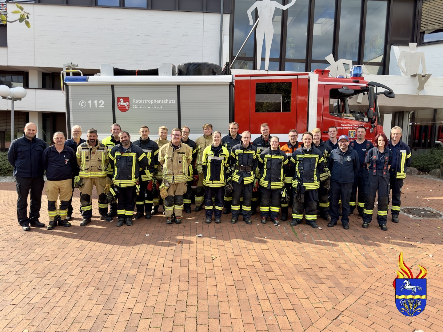 Mit der erfolgreichen Abnahme der ersten modularen Grundlagenausbildung Qualifikationsstufe 3 brach am vergangenen Wochenende ein neues Kapitel in der Ausbildung der ehrenamtlichen Feuerwehrfrauen und -männer im Landkreis Verden an: Über ein Jahr dauerten die Konzeption und Vorbereitungen für die grundlegende Neuausrichtung der Feuerwehrausbildung in Niedersachsen; Lehrgangsteile wurden vom niedersächsischen Landesamt für Brand- und Katastrophenschutz auf Kreisebene verlagert und die vorherige Truppausbildung grundlegend reformiert, erläutert Kreisbrandmeister Dennis Körte: „Ihr habt heute Geschichte geschrieben“, gratulierte er den vierzehn Feuerwehrfrauen und -männern zur erfolgreichen Prüfung. Zugleich dankte er dem Ausbilderteam um die Kreisausbildungsleiter Thorsten Zölle und Sonja Paschkowski.