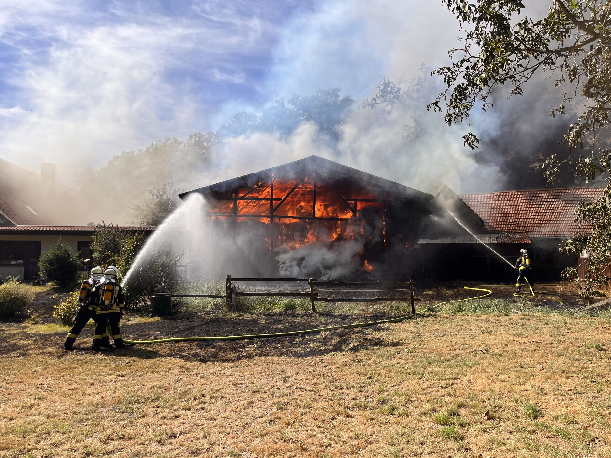 Bereits auf der Anfahrt konnten die Einsatzkräfte weithin einen starken Feuerschein sowie eine entsprechende Rauchentwicklung wahrnehmen. Bei Eintreffen an der Einsatzstelle stand eine landwirtschaftliche Lagerhalle in Vollbrand, so dass umgehend Großalarm für die Stadtfeuerwehr Verden ausgelöst wurde. Der Gebäudebrand umfasste zu diesem Zeitpunkt bereits die rund 300 eingelagerte Rundballen und drohte sich weiter auszubreiten.