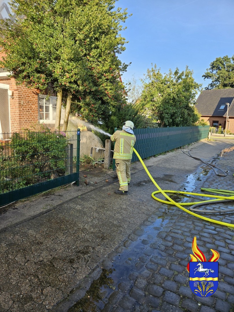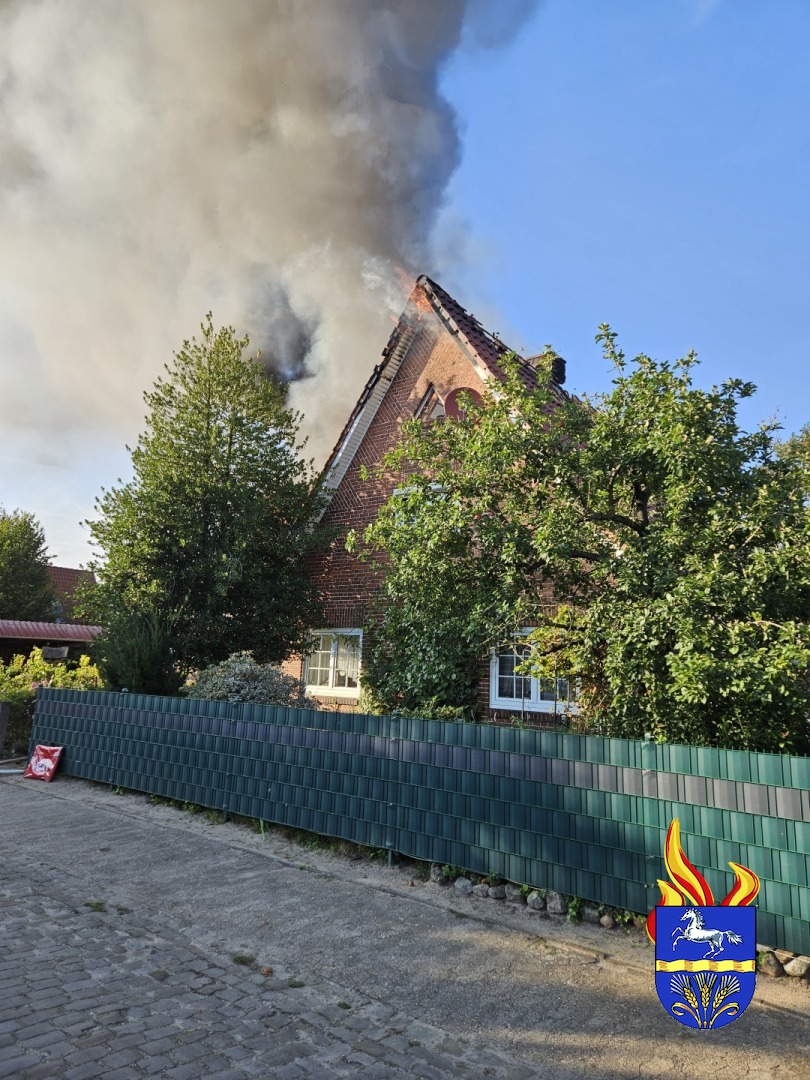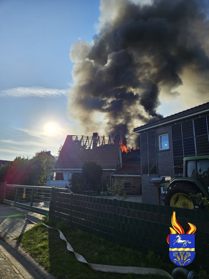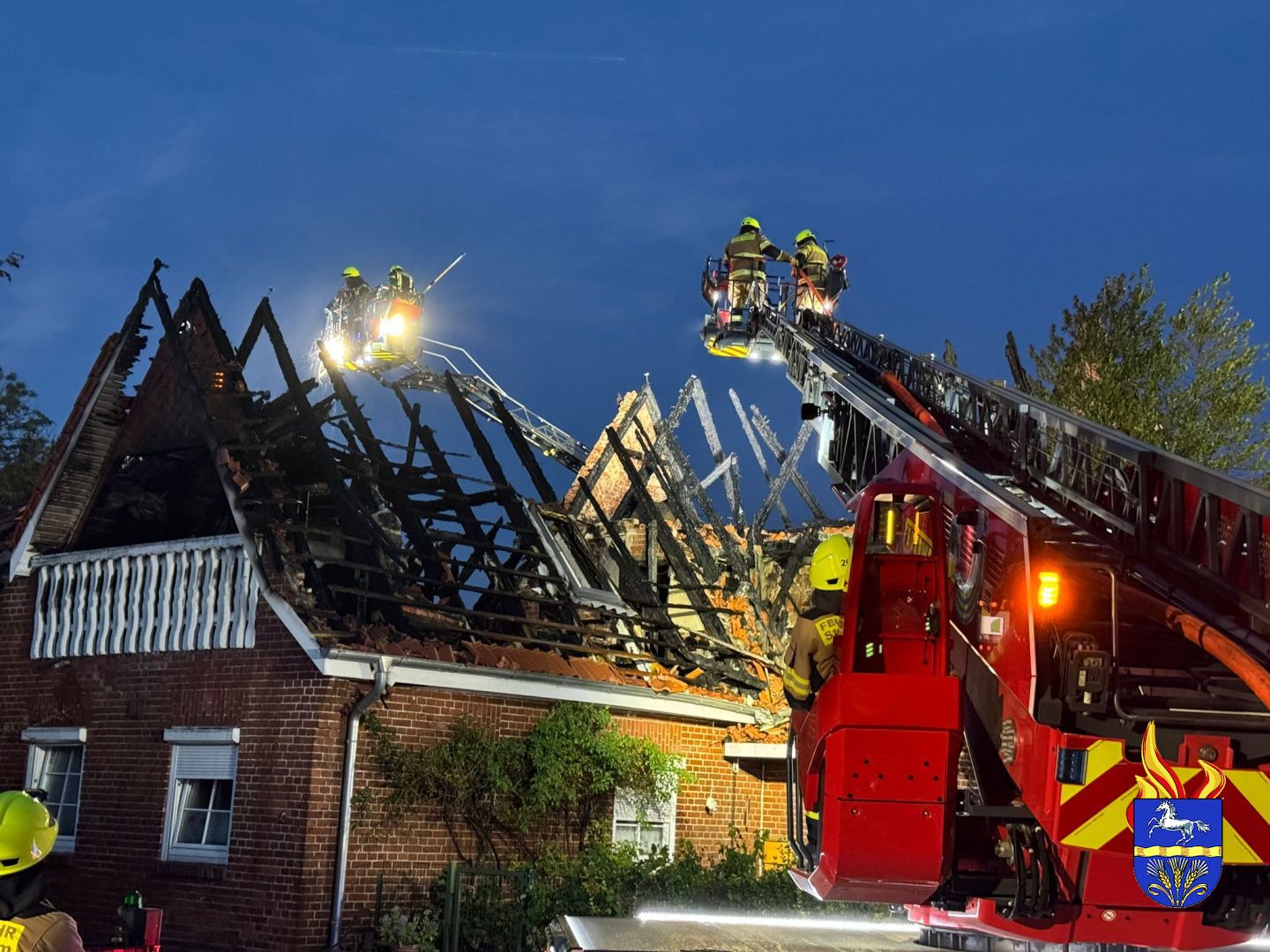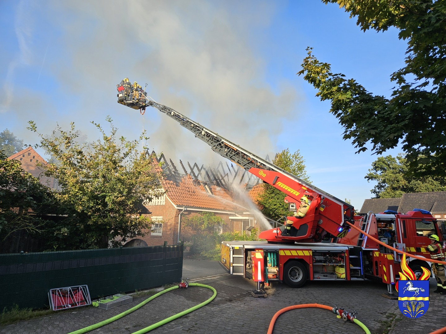Am Dienstagabend wurden die Einsatzkräfte aus der Gemeinde Langwedel zu einem Dachstuhlbrand in Langwedel alarmiert. Die Rauchsäule war bereits aus weiter Entfernung zu sehen, bei Ankunft der ersten Kräfte schlugen die Flammen meterhoch aus dem Dachstuhl. Zwei Trupps unter Atemschutz gingen zur Brandbekämpfung in das Gebäude vor. Aufgrund der starken Wärmeentwicklung wurde jedoch der Innenangriff abgebrochen und das Feuer fortan nur noch von draußen bekämpft, sowie eine Riegelstellung zum Nachbargebäude aufgebaut.