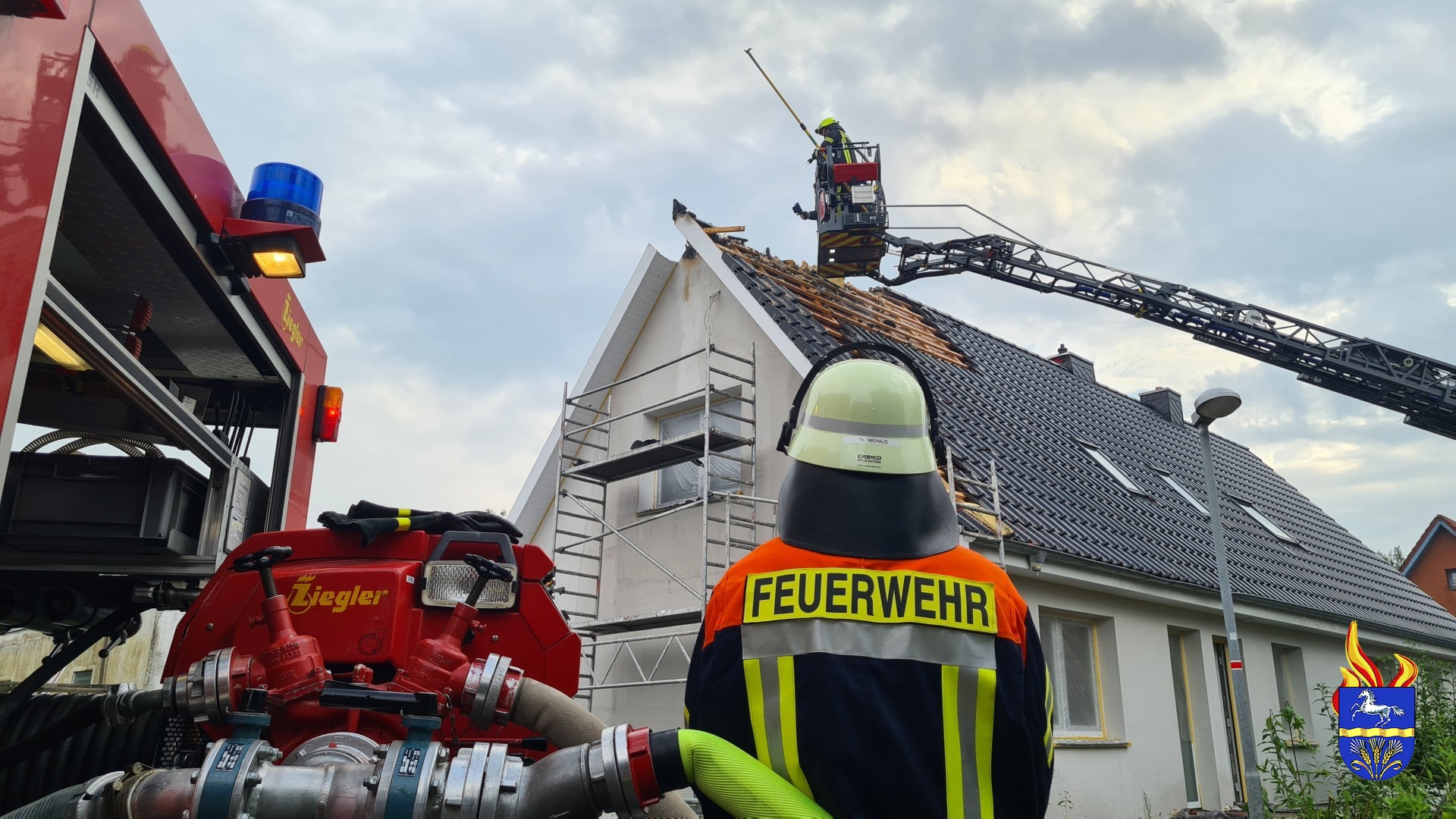 Ein schweres Gewitter hat am heutigen Morgen gegen 08:04 Uhr einen Großeinsatz der örtlichen Feuerwehren ausgelöst. Ein Blitz schlug in den Dachstuhl eines Zweifamilienhauses in der Straße „An der Bahn“ ein und setzte diesen in Brand.