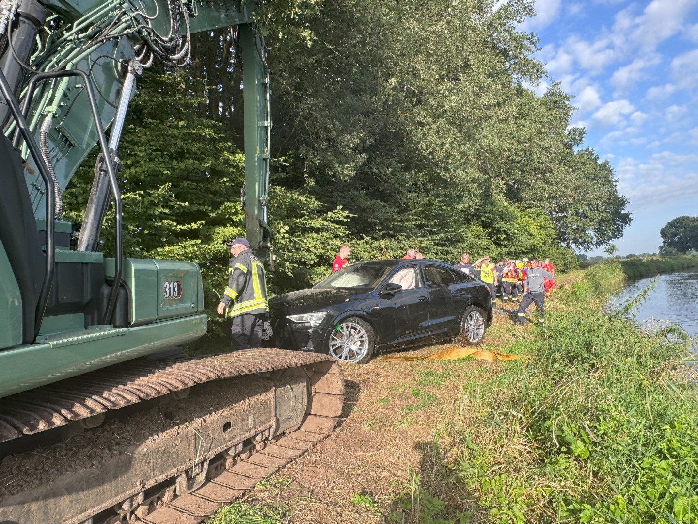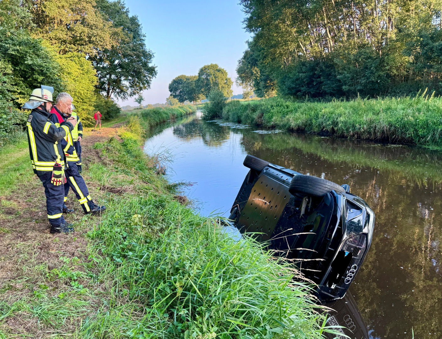 Weit abseits der befestigten Straßen ist am frühen Morgen gegen 6:00 Uhr ein Audi e-tron beim Rangieren in den Wümmesüdarm zwischen Fischerhude und Oyten-Sagehorn gerutscht und war schräg auf der Seite liegengeblieben.