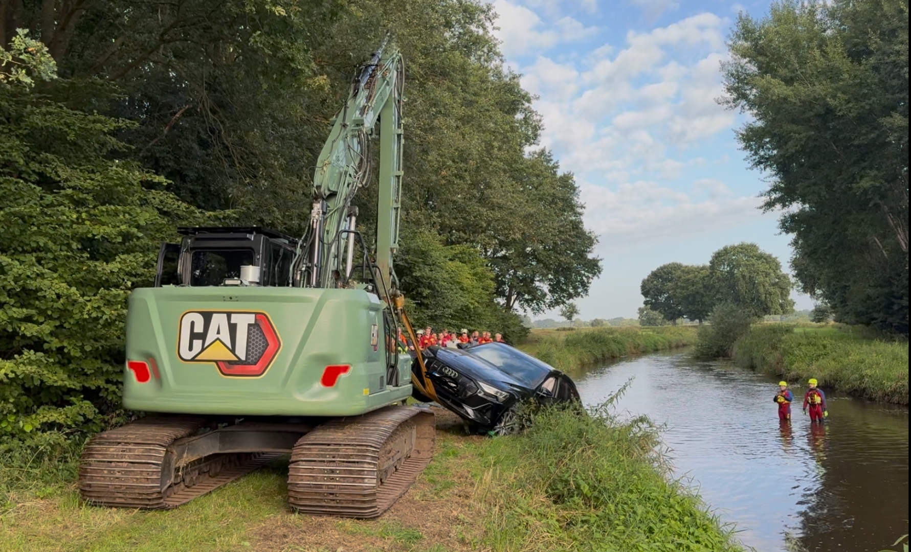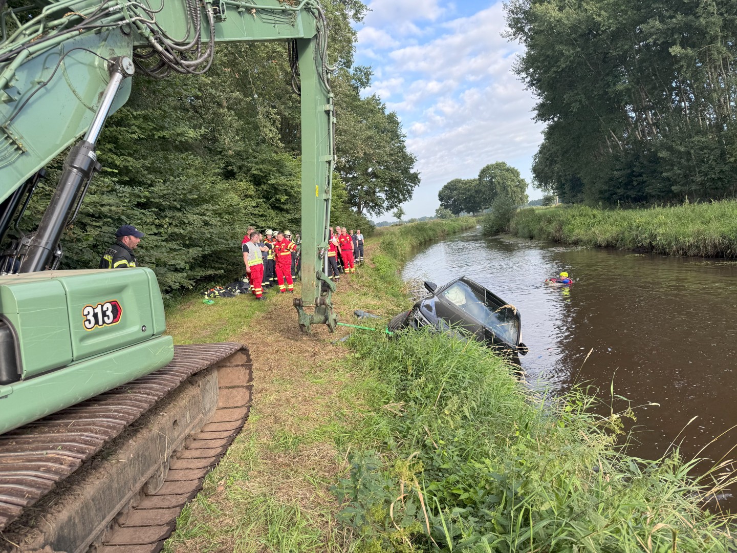Weil der Wagen an einer Stelle lag, die ein Abschleppwagen nicht erreichen konnte, wurde vom Unterhaltungsverband untere Wümme ein Kettenbagger angefordert.