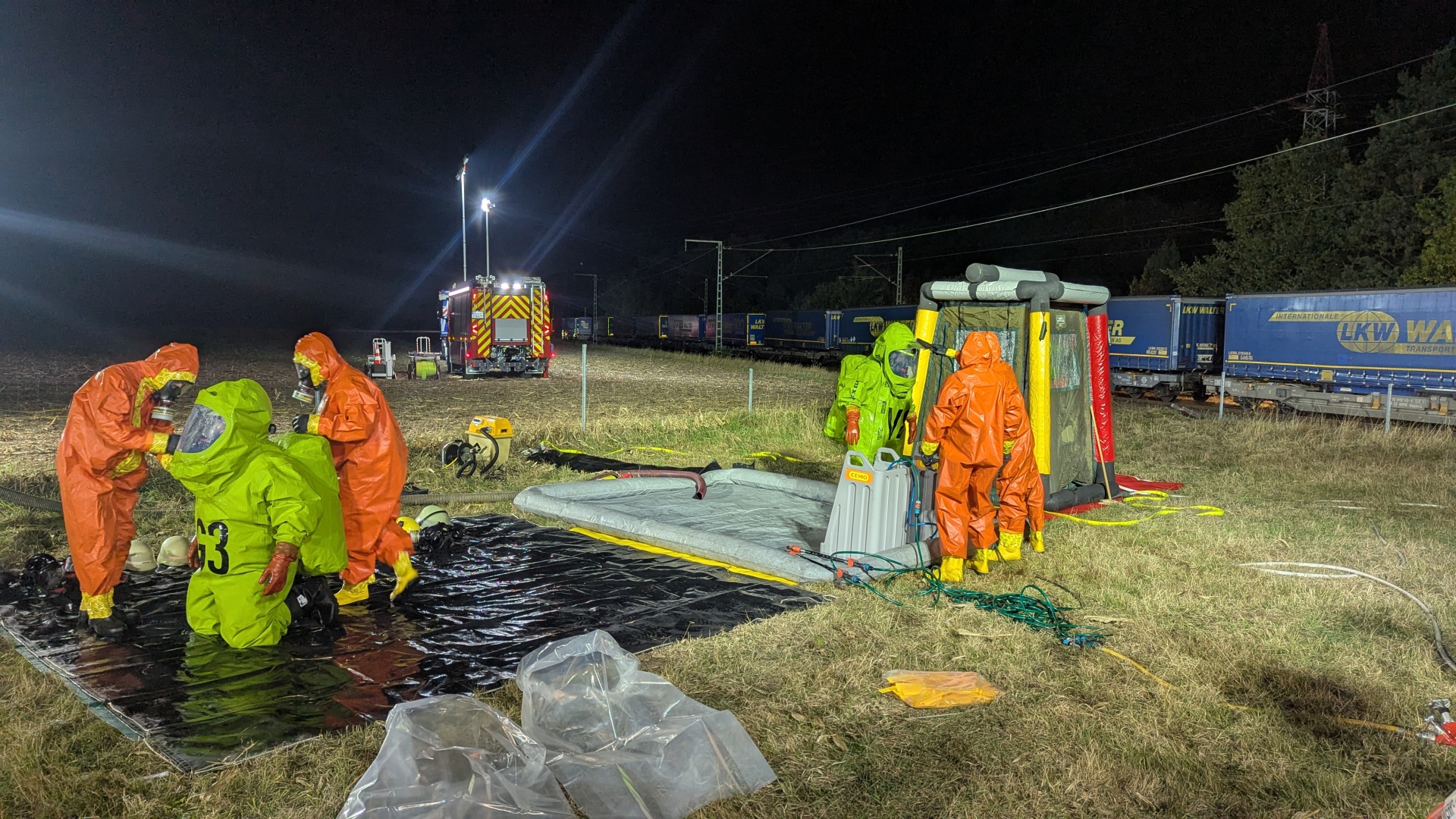 Es handelte sich um ein umweltgefährdend und gesundheitsschädliches Granulat, das in sogenannten Big Bags transportiert wurde. Einer dieser Säcke wies einen etwa 10 cm langen Riss auf, durch den das Material ausgetreten war. Parallel zum Erkunden wurde eine Dekontaminationsstation aufgebaut, um die Einsatzkräfte nach ihrem Einsatz zu reinigen.